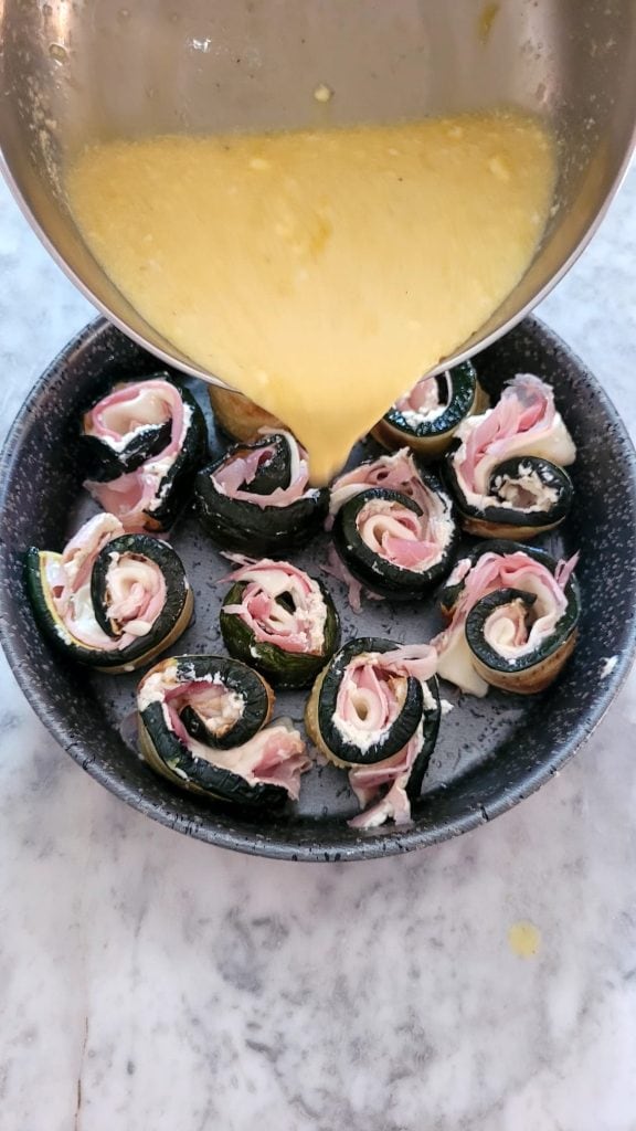 • Add a strip of cheese slice on each piece. Take the end of the zucchini and roll it up