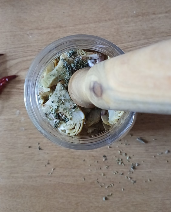 Continue layering as before. Artichokes, oregano, press well, garlic, and chili pepper until you reach 3 cm from the lid’s edge (as in the photo).
