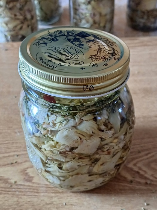 While the artichokes are cooling, sterilize the jars which should cool and will be used at the end.