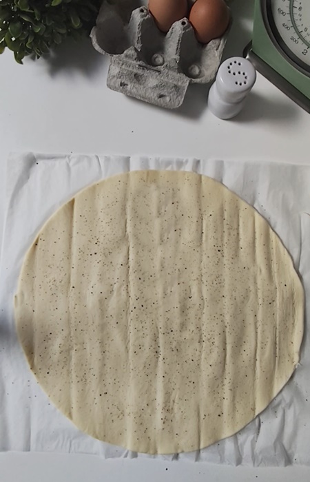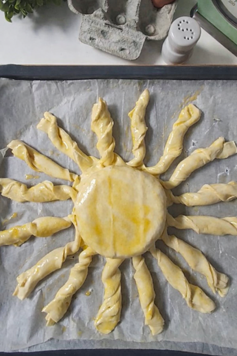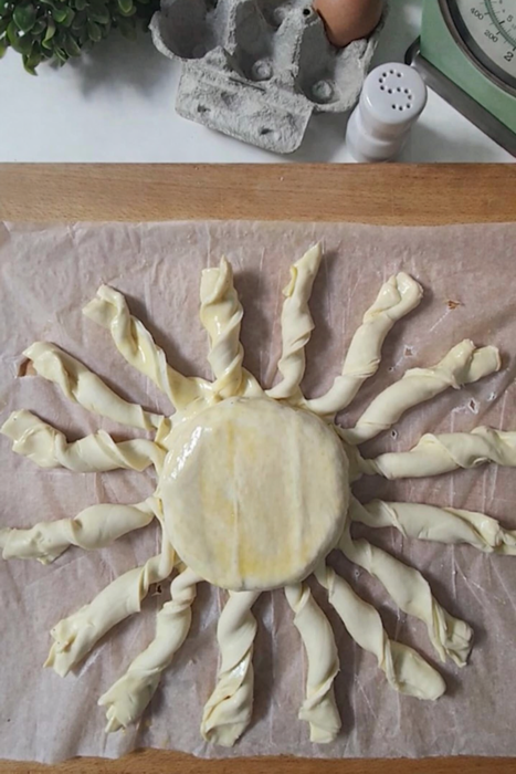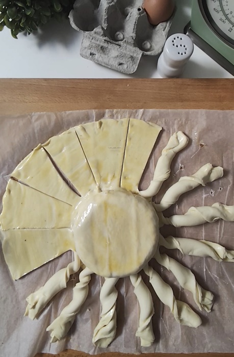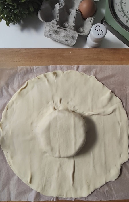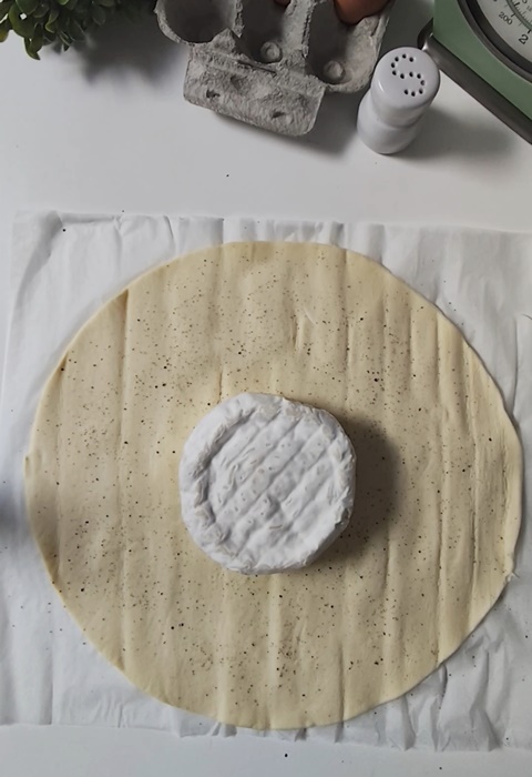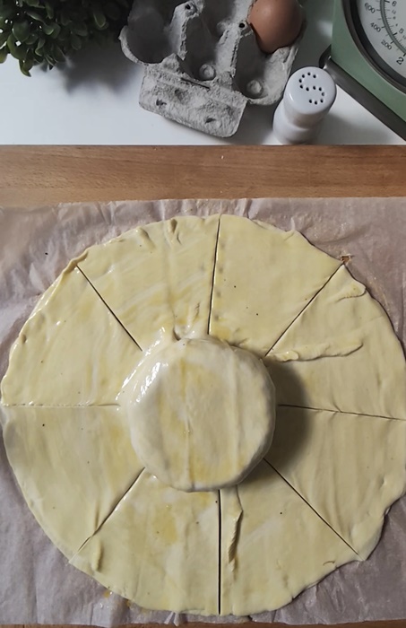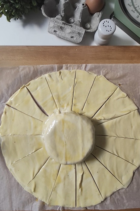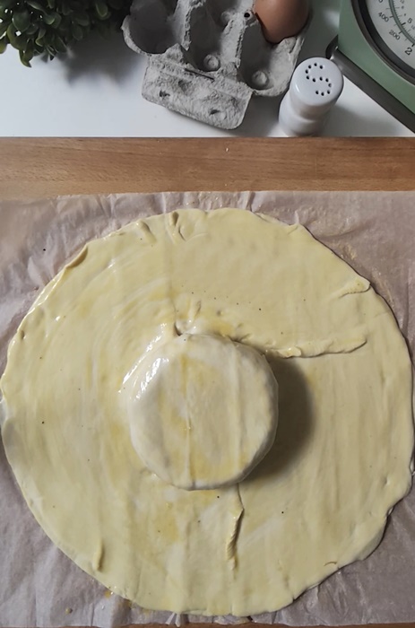 Cover with the other puff pastry, making it adhere well to the shape of the camembert and slightly stretching it to make it then match the base pastry (see photo below or video above).