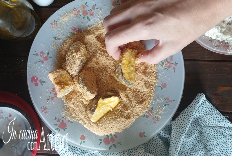 • Continue breading all the mushrooms the same way: flour, eggs, breadcrumbs until they’re all ready.