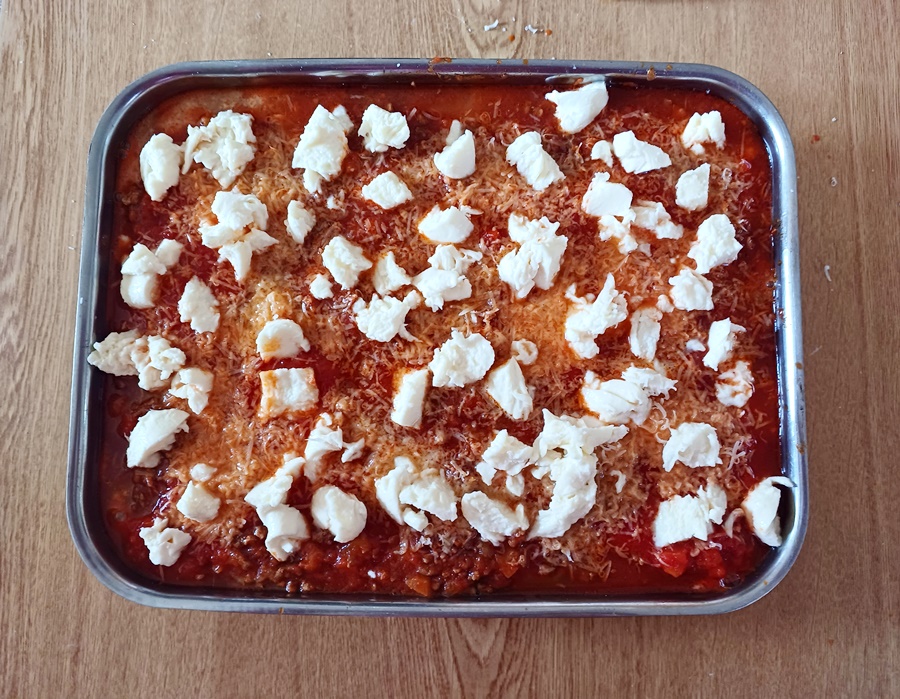 I sometimes also prepare 10 oz of tomato separately (taken from the total), cooked simply with chopped onion and carrot, salt, and pepper, without letting it dry out too much during cooking, and I use it only as the first and last layer. You can do it too, or just use the sauce as the first and last layer.
