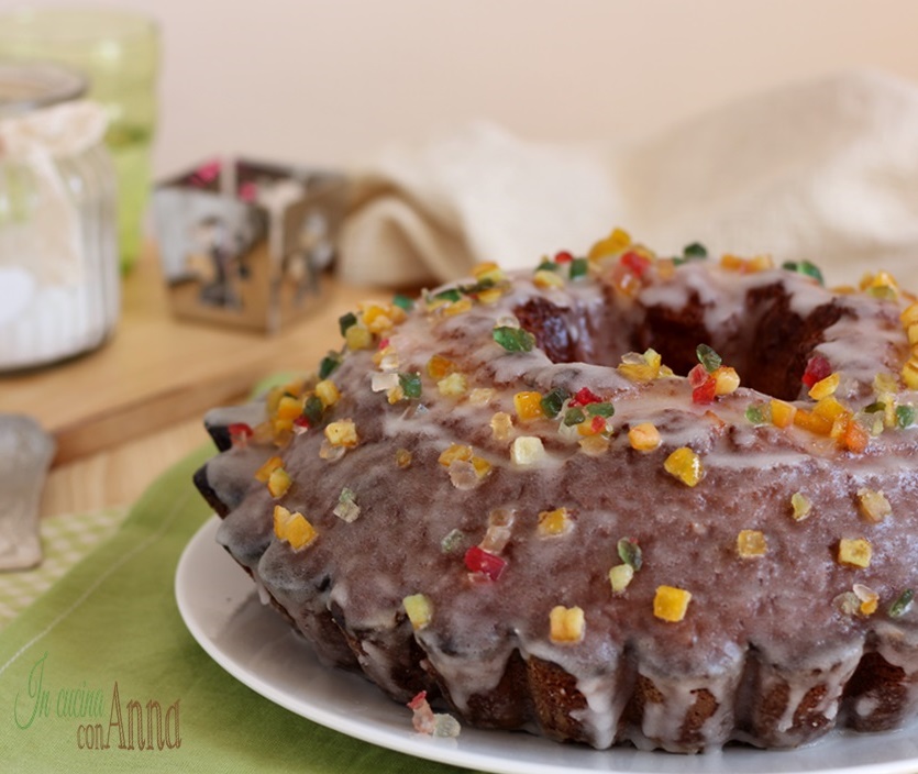 Spread the glaze over the bundt cake and immediately decorate with candied fruit.