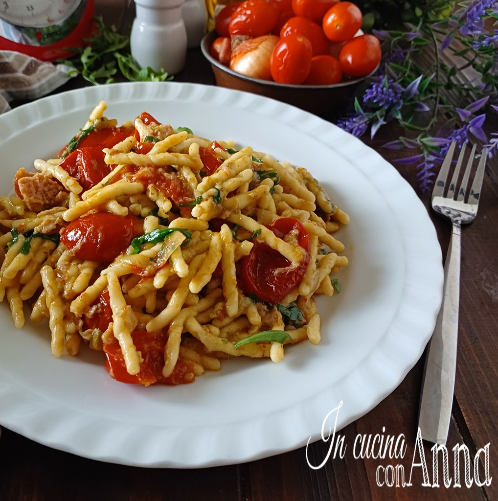 Add the remaining chopped arugula to the cherry tomatoes which are now cooked, and you have turned off the heat. Add a pinch of pepper and the tuna drained a bit from its oil, add the arugula pesto prepared before, mix everything together (I don’t add salt because of the salted ricotta, taste to see if it’s seasoned to your liking).
