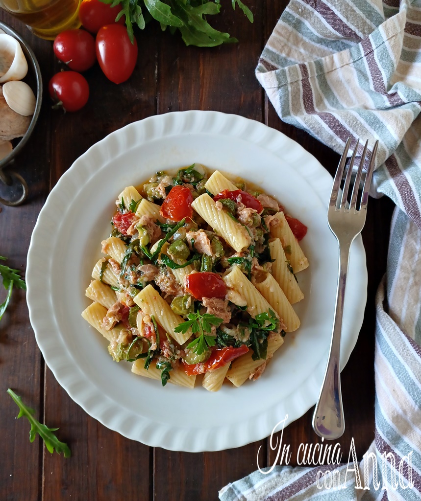 The pasta with zucchini, cherry tomatoes, arugula, and tuna is a very simple dish to prepare, quick and extremely delicious, a mix of ingredients that come together creating a dish that will win you over at the first taste.