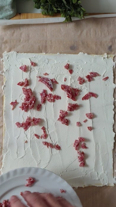 Cover the ricotta with the chopped salami and a grind of black pepper.