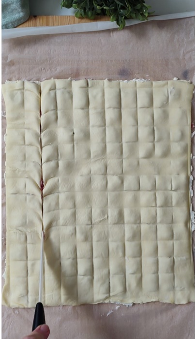 Now take the oven rack and press it onto the pastry to create lines — you do not need to cut the pastry, just create surface ridges.