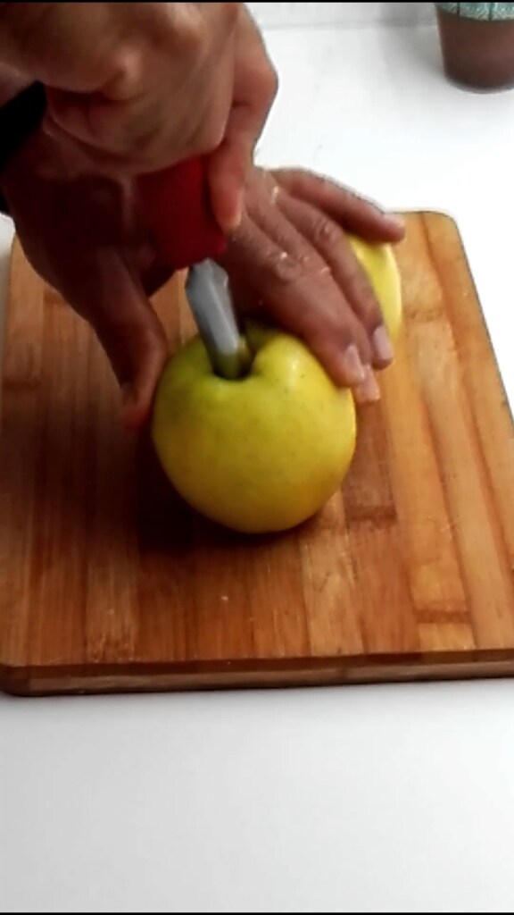 First, remove the core from the apples and then cut them into not too thin slices. We left the peel on, but you can remove it if you wish.