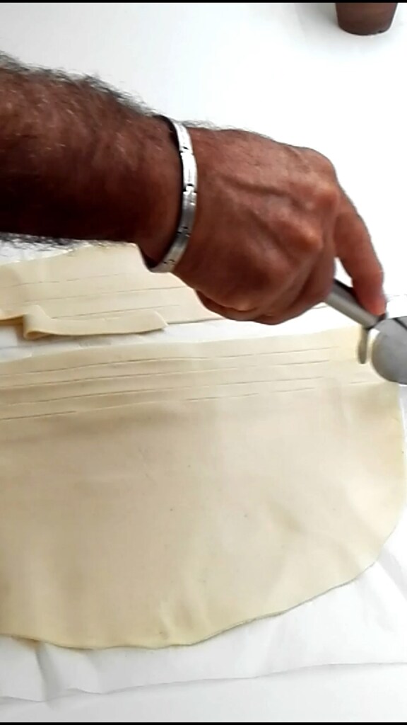 Unroll the puff pastry and cut it into thin strips, about 0.4 inches, using a dough cutter or a knife.