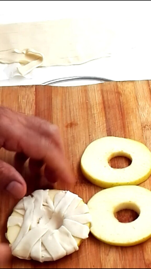 Wrap each apple slice with puff pastry strips, ensuring it is well covered.