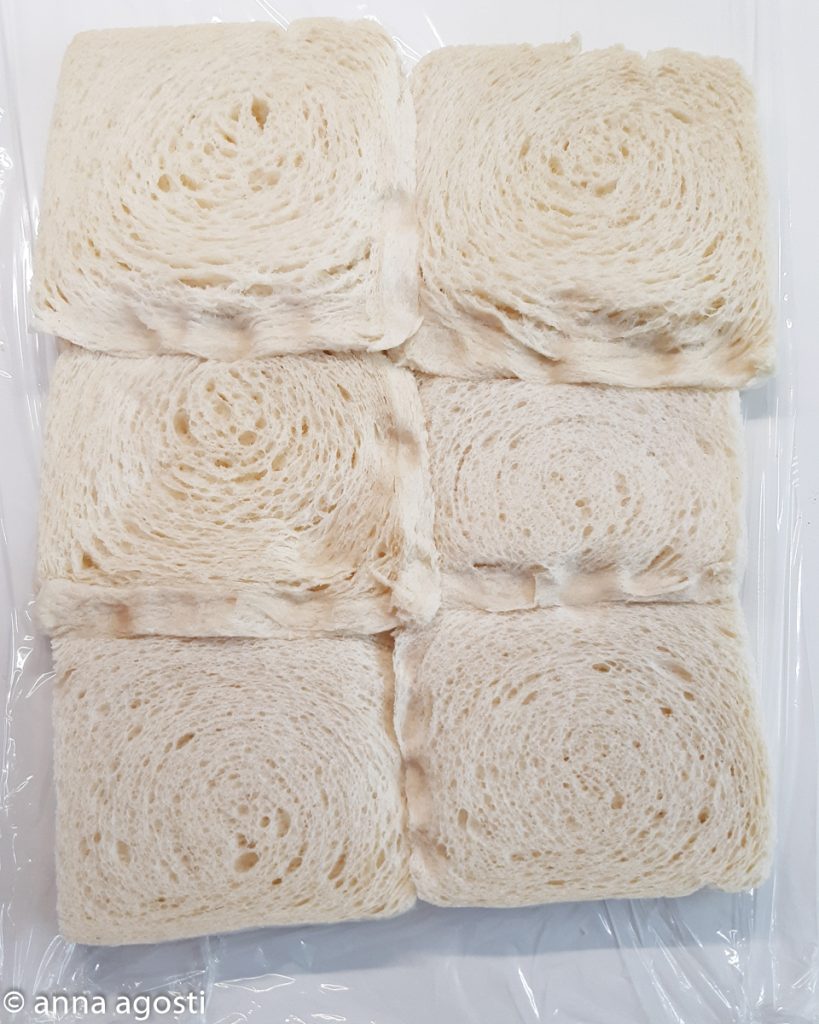 Cover a cutting board with plastic wrap, place 6 slices of sandwich bread slightly overlapping each other on top.