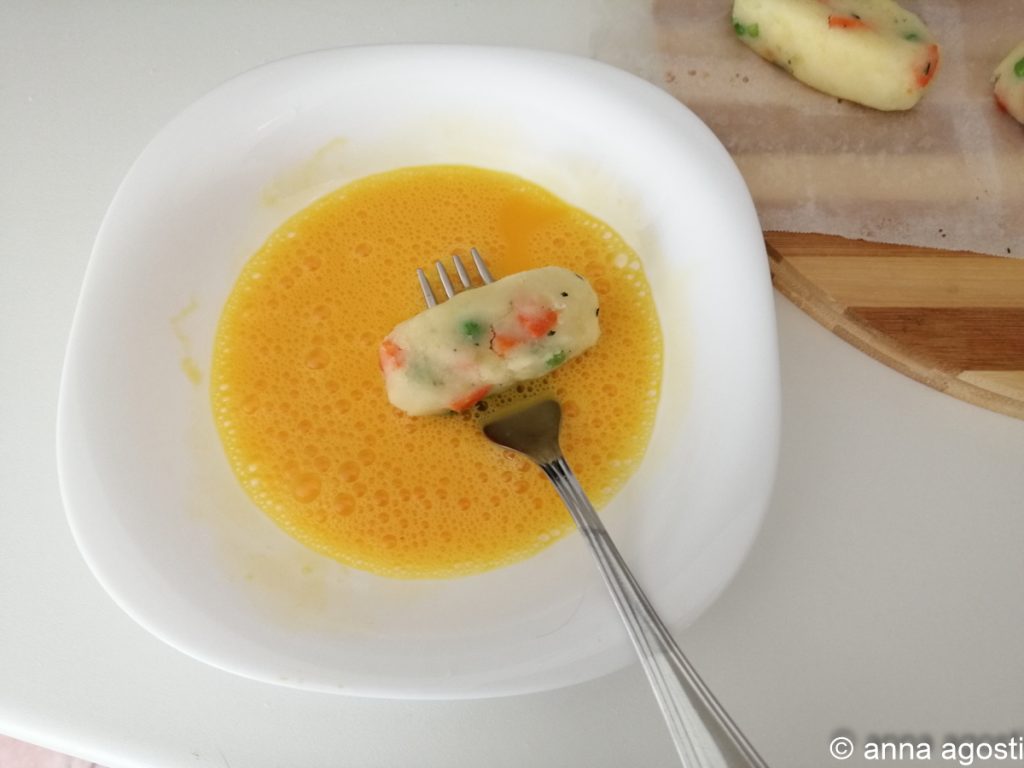 Pass the croquettes first in the beaten egg and then immediately in the breadcrumbs, doing a second pass both in the egg and in the breadcrumbs.