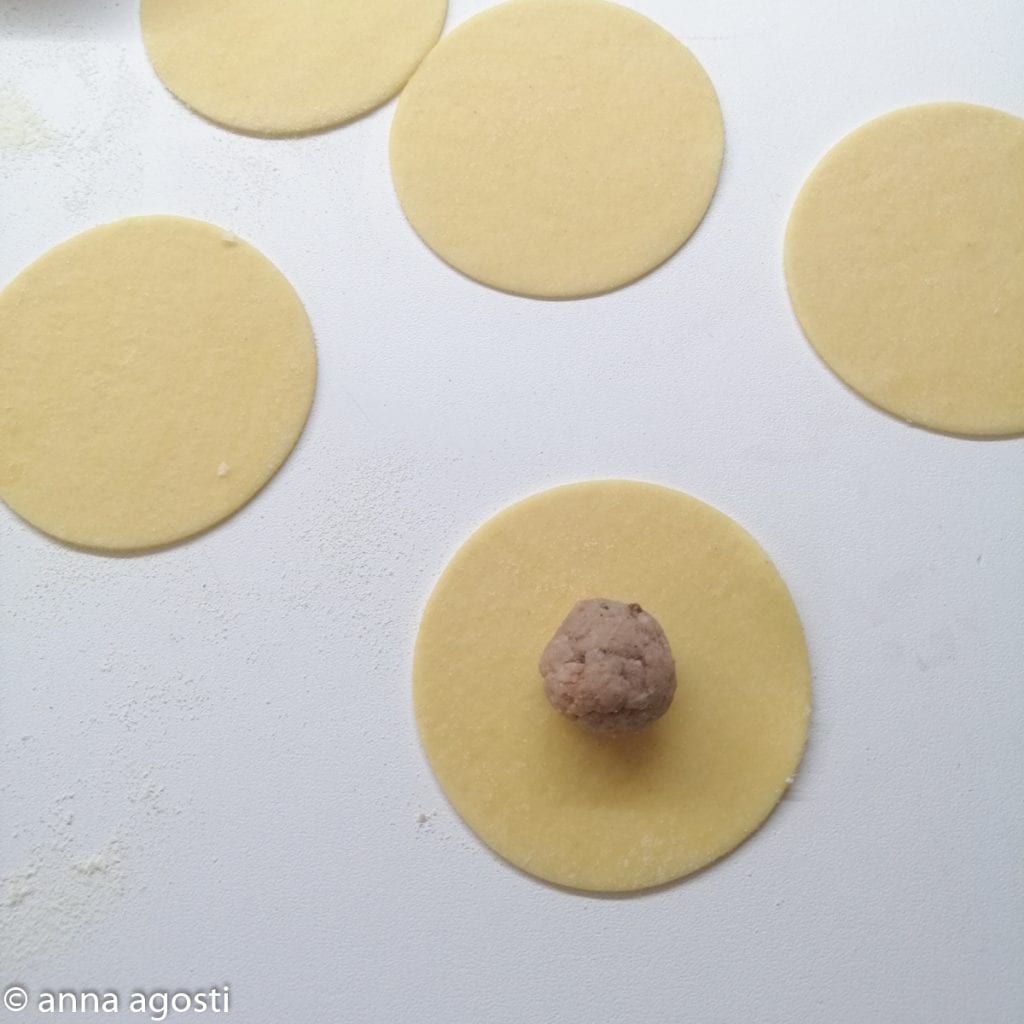 With your hands, take a small ball of filling (about 1/4 oz) and place it in the center of each pasta disc.