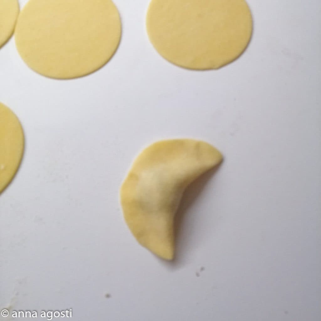 Using a round pastry cutter of 2 1/2 inches, cut out many discs. Knead the leftover pasta and cut out more discs.