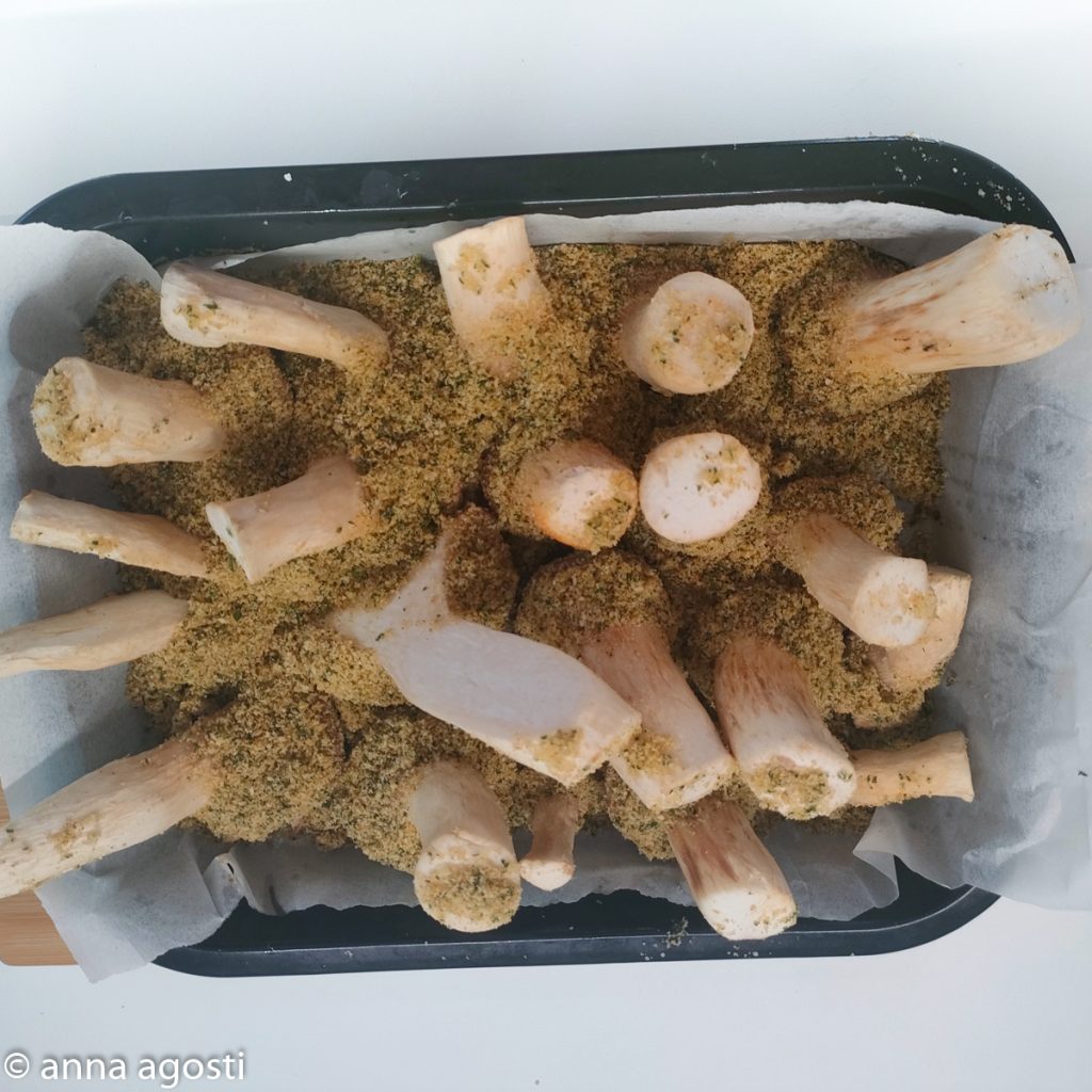 Bake in the middle rack of the preheated oven and cook the gratinated cardoncelli mushrooms for 25 minutes or until you see the breading golden and crispy.