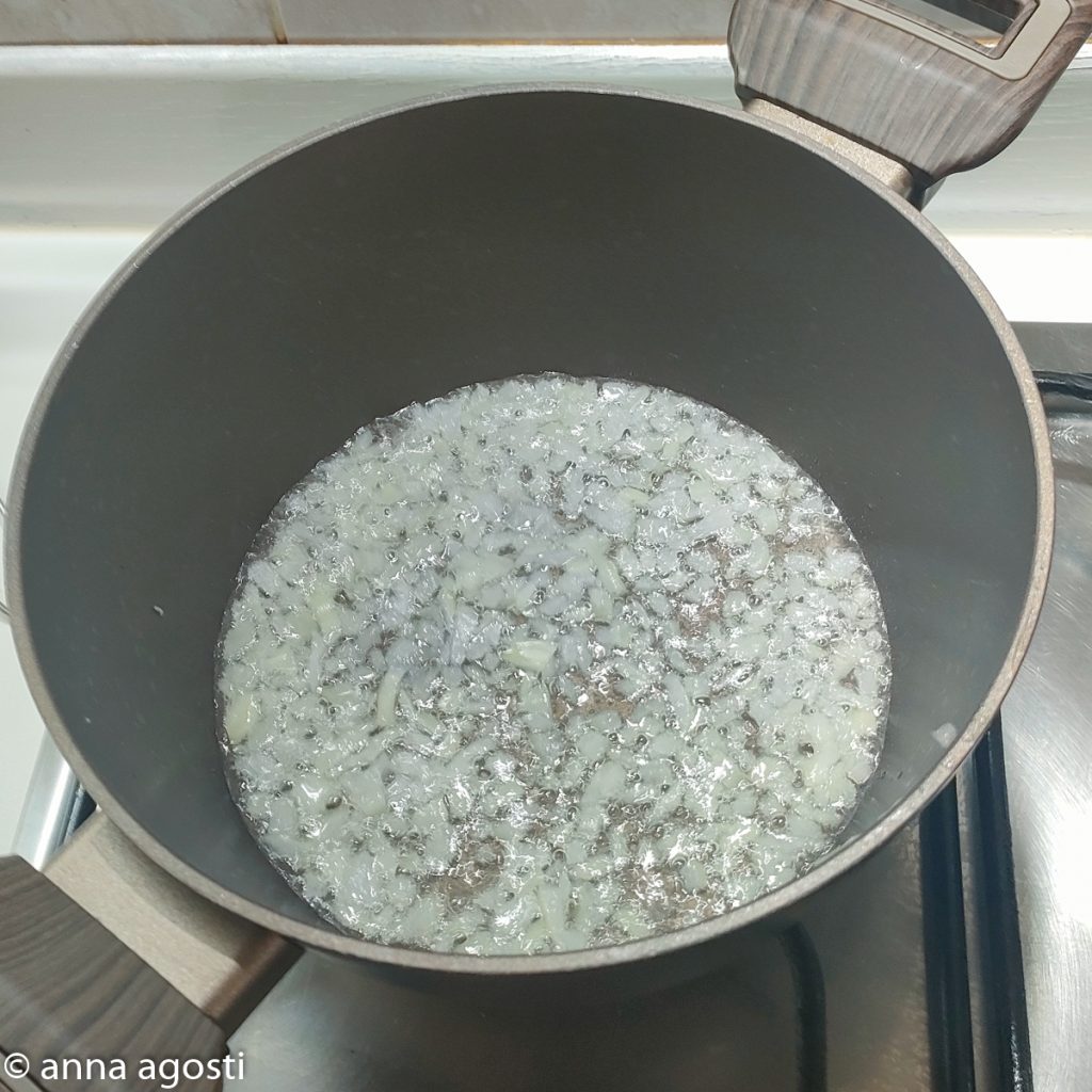 • Finely chop the onion and sauté it with a drizzle of extra virgin olive oil until it becomes almost transparent.