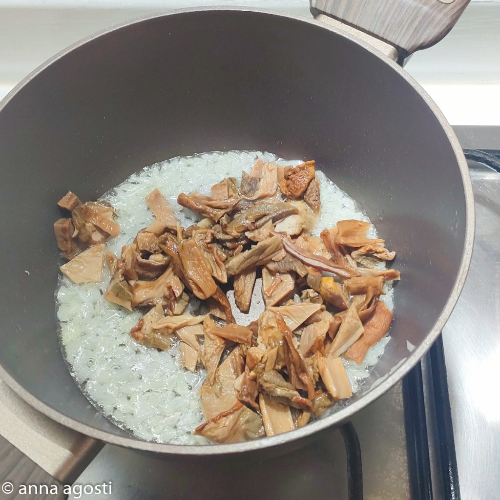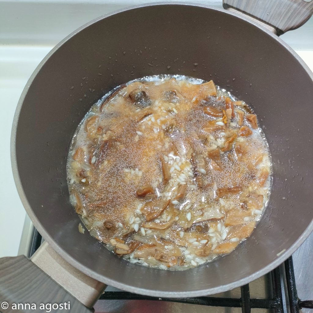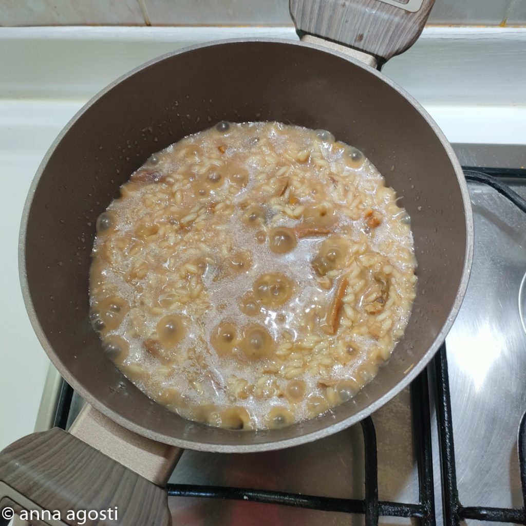 If you use fresh porcini mushrooms, there’s no need to soak them, but sauté them in a pan with a little oil for at least 10 minutes before adding them to the pot for risotto cooking.