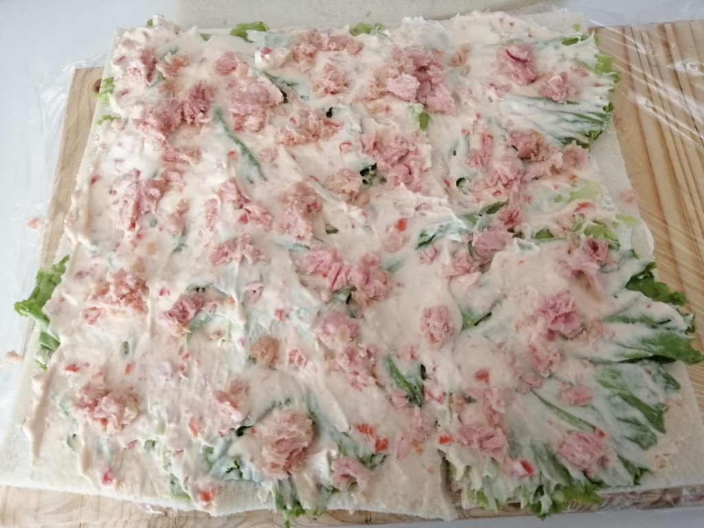 Finish with the remaining crumbled tuna and, using plastic wrap, close the rolled sandwiches like at the bar with light pressure.