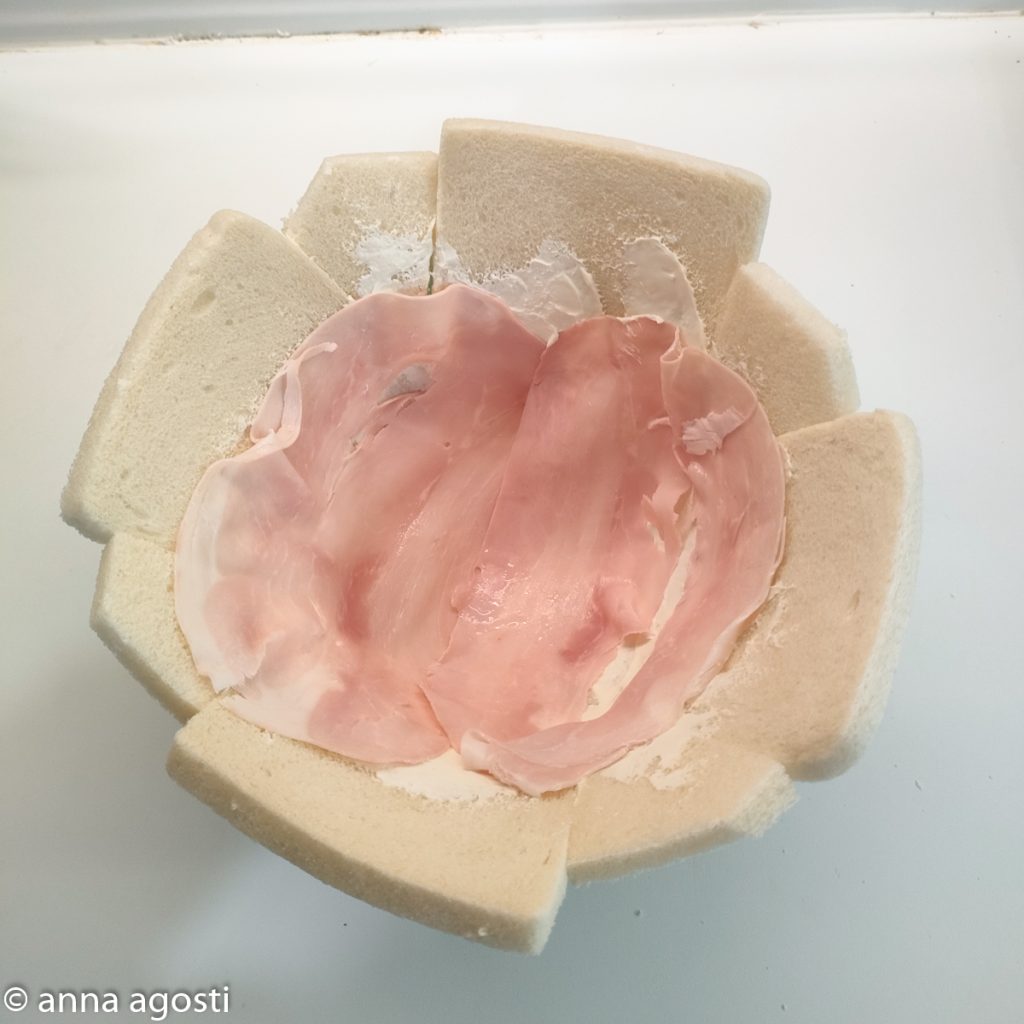 Cover the surface with spreadable cheese (you can also use mayonnaise if you prefer) and stripe with the tines of a fork.