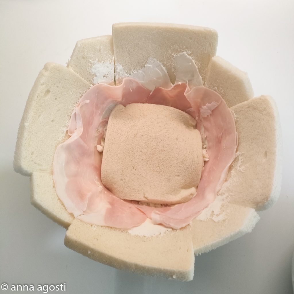 Cut some slices to cover the empty spaces; the slices of bread should extend beyond the edges of the bowl so you can fold them over.Spread with the fresh cheese using a rubber spatula to distribute it.