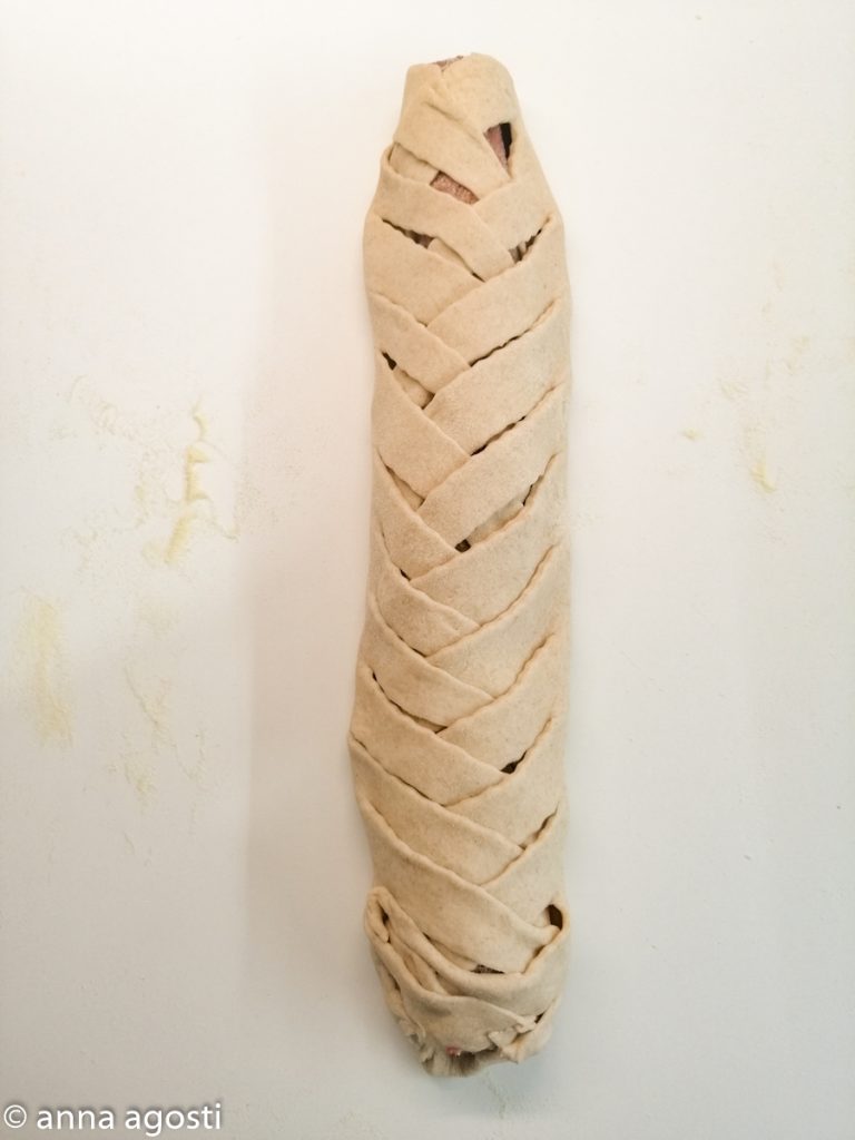 Start from the side farthest from you and braid the bread dough over the meat log.