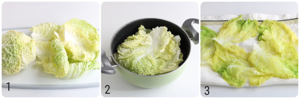 Detach the leaves from the cabbage and choose the widest ones, wash them well and blanch them for about 5 minutes in slightly salted boiling water, they should be cooked but not too soft. Drain them and let them dry spread out on a cloth.
