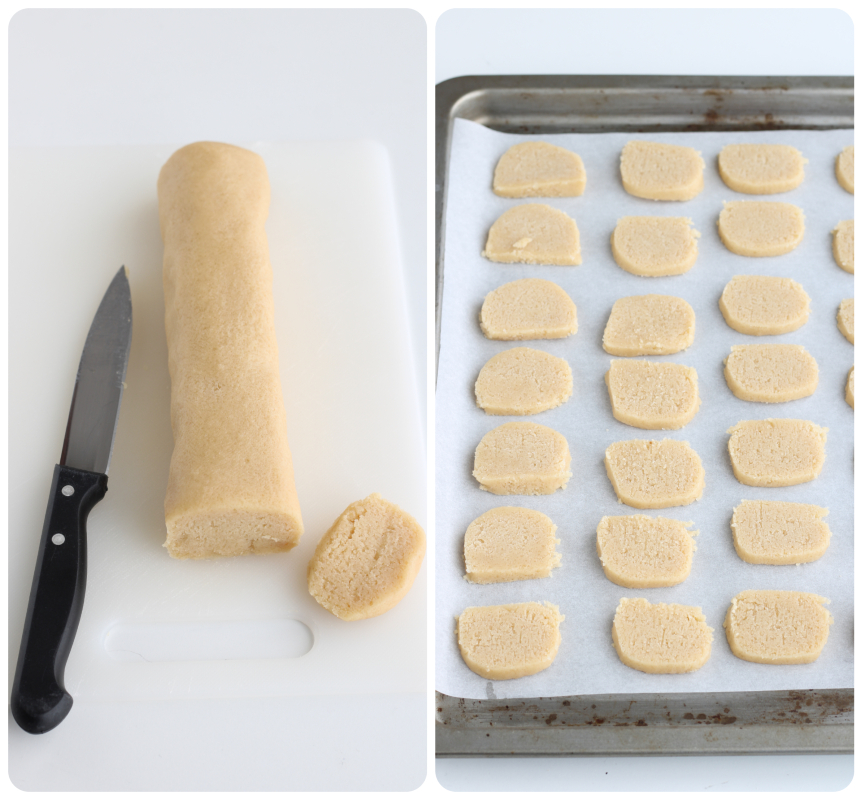 Roll the dough into a cylindrical shape, cover, and let it rest for about 1 hour. After the time has passed, cut the dough with a smooth blade knife into many discs about 1/4 inch thick each.