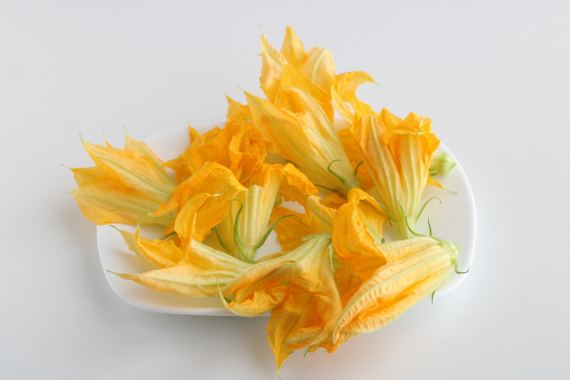 Now complete by arranging the whole but spread-out zucchini flowers in a circle (open them only on one side), previously set aside.