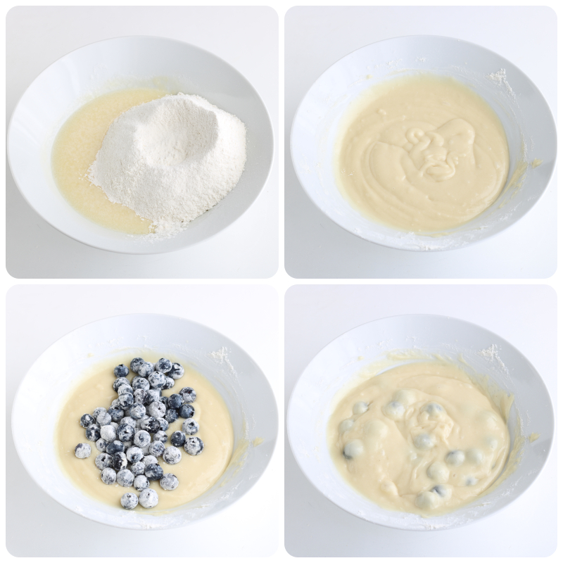 Lightly coat the blueberries with flour and gently incorporate them into the batter, being careful not to crush them.