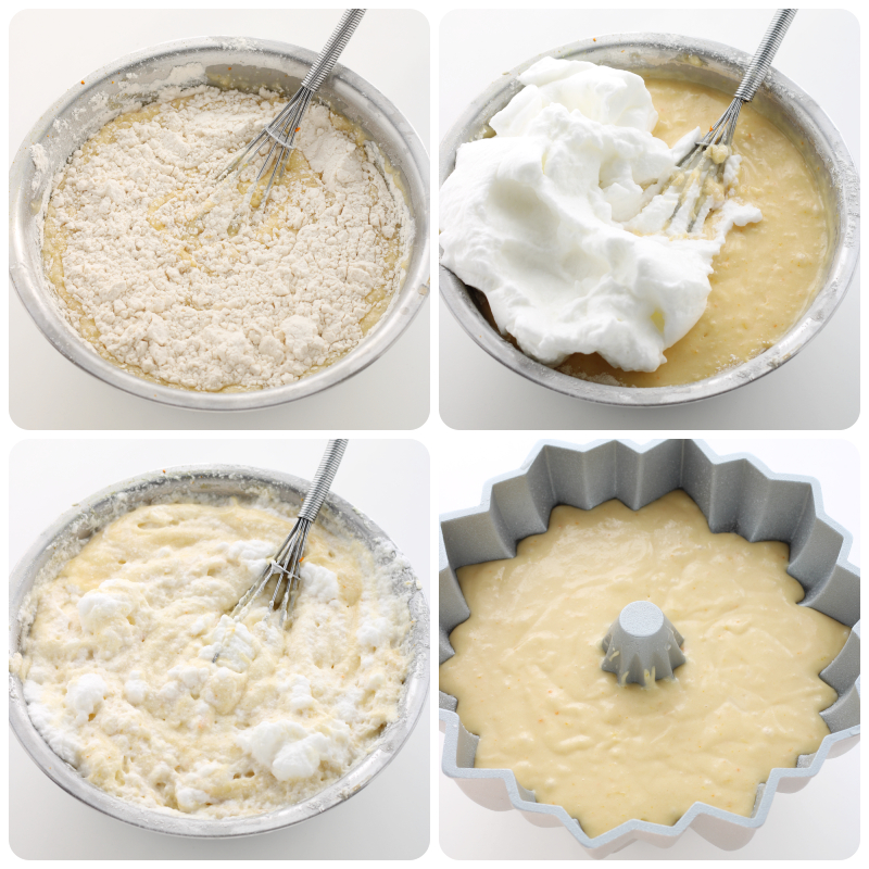 Separate the yolks from the whites, beat the yolks with the sugar, add the butter melted in a double boiler and mix. Add the milk, the zest and juice of two oranges, the sifted flour, and a packet of baking powder.