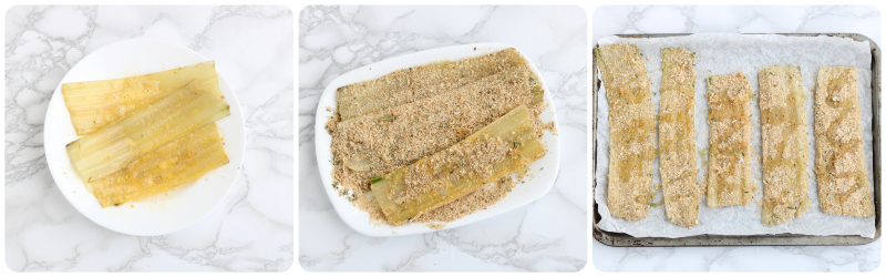 Now line a baking tray with parchment paper and arrange the coated stems side by side, drizzle with a little olive oil and bake in a static oven at 356°F for about 20 minutes, when they start to turn golden they are ready.