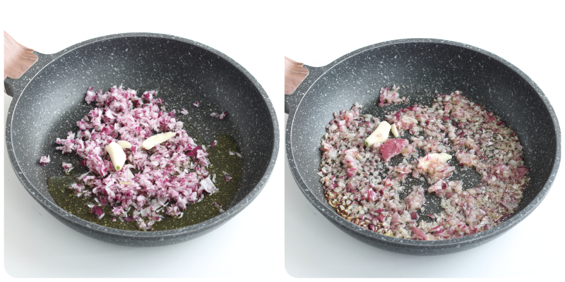 In a large pan, pour the oil, heat it, add the chopped onion, and let it brown.