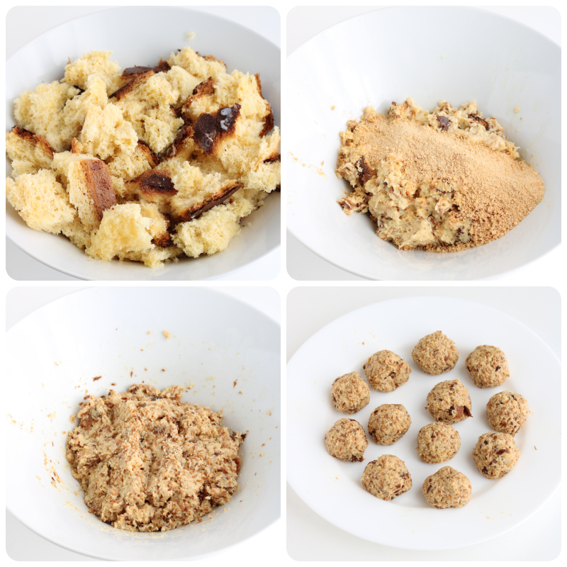 Break the pandoro into pieces, soak it with milk, a splash of amaretto liqueur, and after a few minutes (once the pandoro has well absorbed the liquids) squeeze it well with your hands.