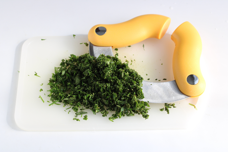 Chop them all together finely with a mezzaluna or a mixer.