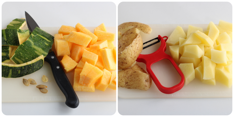Peel and cut the potatoes into pieces the same size as the pumpkin.