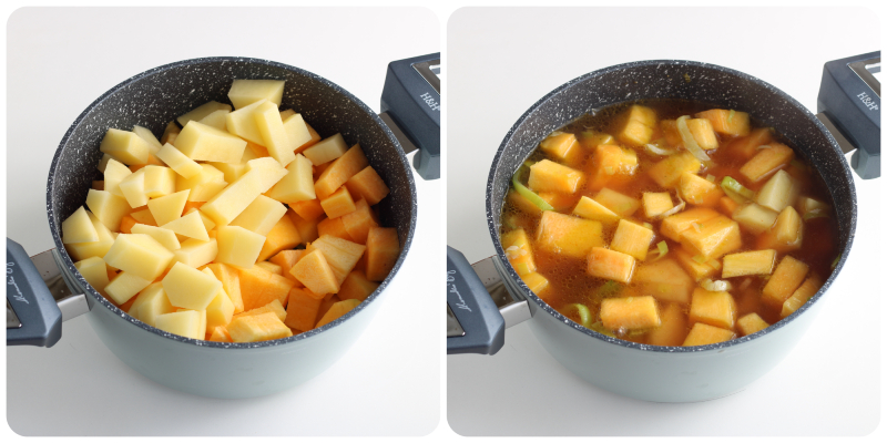 Add the pumpkin and potatoes to the leek sauté, mix well, and let them absorb the flavor for a couple of minutes, then pour in the hot vegetable broth to cover them.