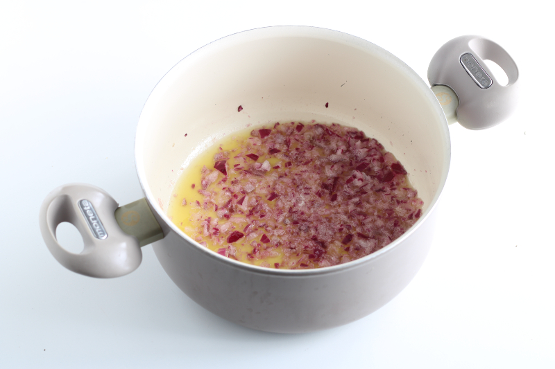 In a saucepan, soften the finely chopped onion in 4 tablespoons of oil and half the butter, as soon as it starts to brown, add the rice and toast it.