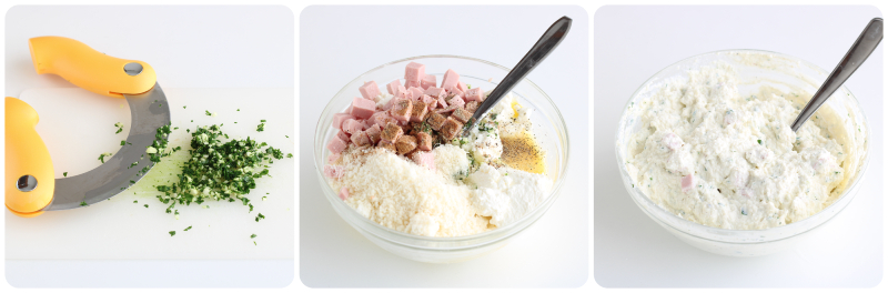 In a large bowl, place the ricotta, diced cooked ham, grated Parmesan, chopped parsley and garlic, and beaten eggs (reserve some to brush the edges of the pastry at the end), nutmeg, salt, and pepper. Mix everything together until the ingredients are well combined.