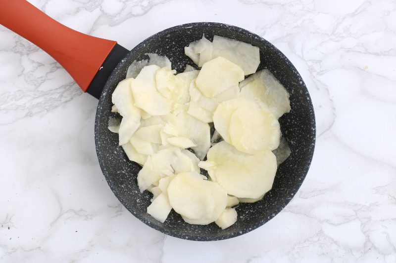 Put some olive oil in a skillet, add the freshly sliced potatoes, and brown them on all sides for about 10 minutes.