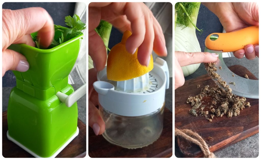 Wash and chop the parsley using a mixer or a manual herb chopper (my favorite), squeeze half a lemon with the citrus juicer and coarsely chop the capers with a mezzaluna, after previously desalting them.