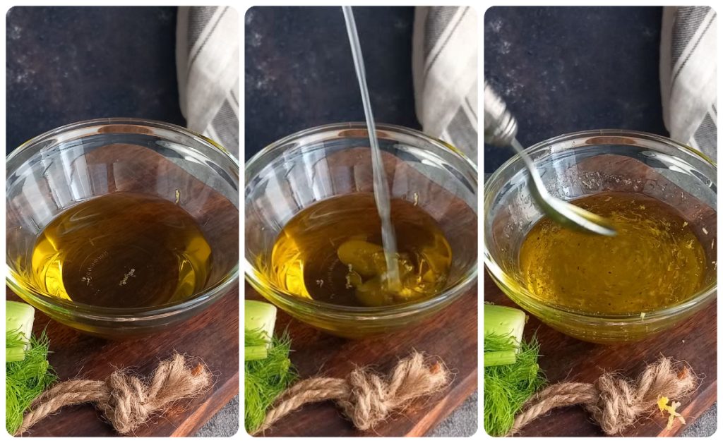 Emulsify in a bowl olive oil with the juice and grated zest of half a lemon, salt, and pepper.