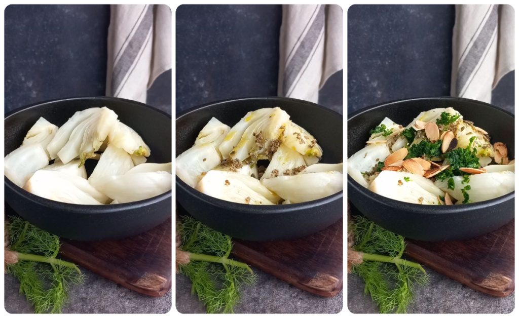 This side dish of steamed fennel, seasoned with a fragrant caper and lemon dressing, is truly amazing. If we also add the crunchy note of toasted almond flakes, the result becomes absolutely irresistible.