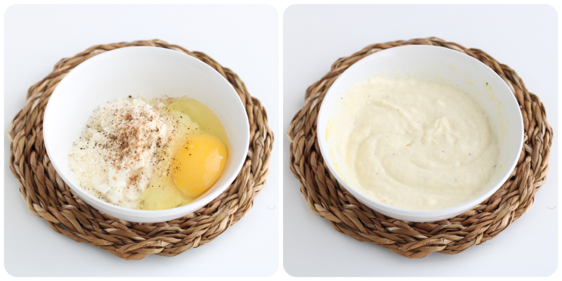 In a bowl, mix the ricotta with the Parmesan, the egg, a pinch of salt, pepper, and a grating of nutmeg. Mix well until you get a creamy mixture.