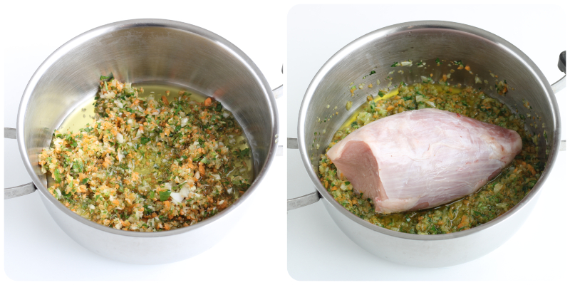 In a pan, sauté the oil with the chopped vegetables, then place the veal round, brown it and, with the help of a spatula, turn it on all sides, season with salt and pepper.