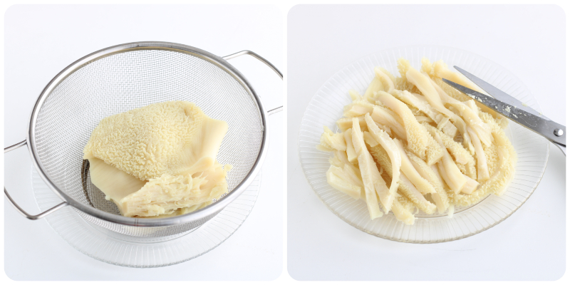 Once cooked, drain the tripe well and let it cool completely, then cut it into very thin strips (about 4 inches long and finger-width) diagonally, so it becomes even softer.