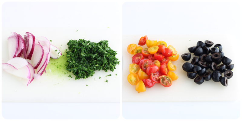 slice the fresh spring onion thinly, finely chop the fresh parsley, cut both the cherry tomatoes and the black olives in half.