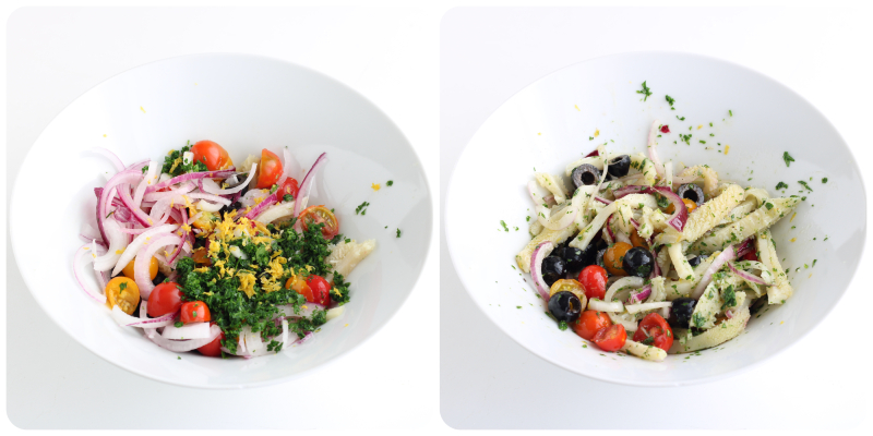 In all versions, dress with good quality extra virgin olive oil, salt, freshly ground pepper, and lemon juice or wine vinegar.