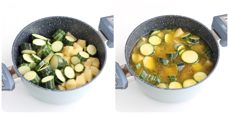 Add the sliced zucchini and the cubed potatoes, sauté for a few minutes, then pour in the broth until the vegetables are covered.