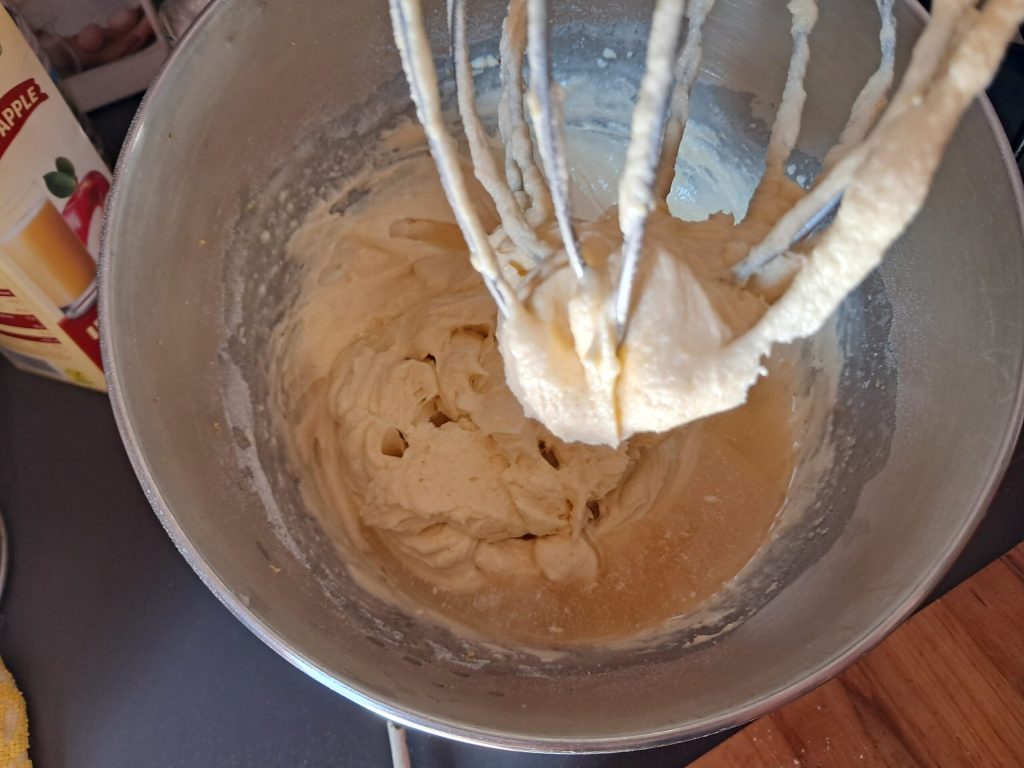 Once all the flour is incorporated, add the apple juice and stir until absorbed.