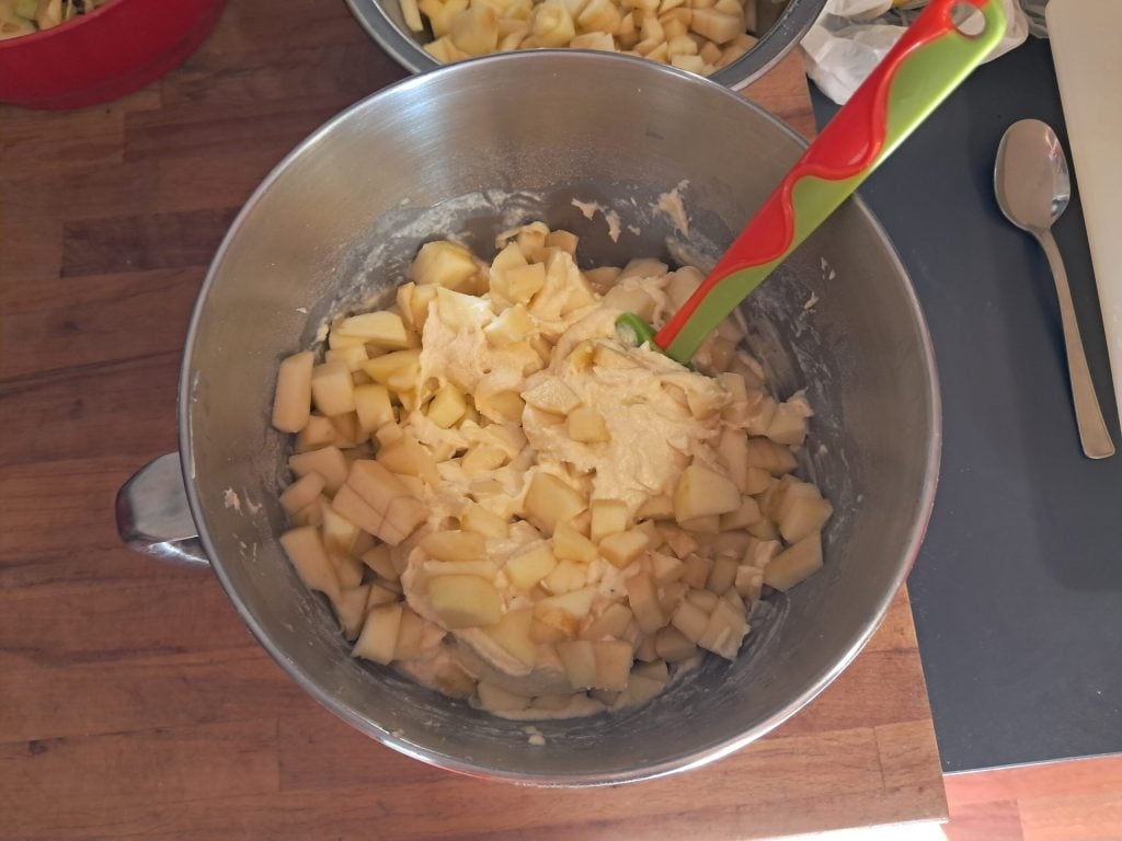 Now remove the bowl from the mixer and start incorporating the apples until you get a homogeneous mixture.